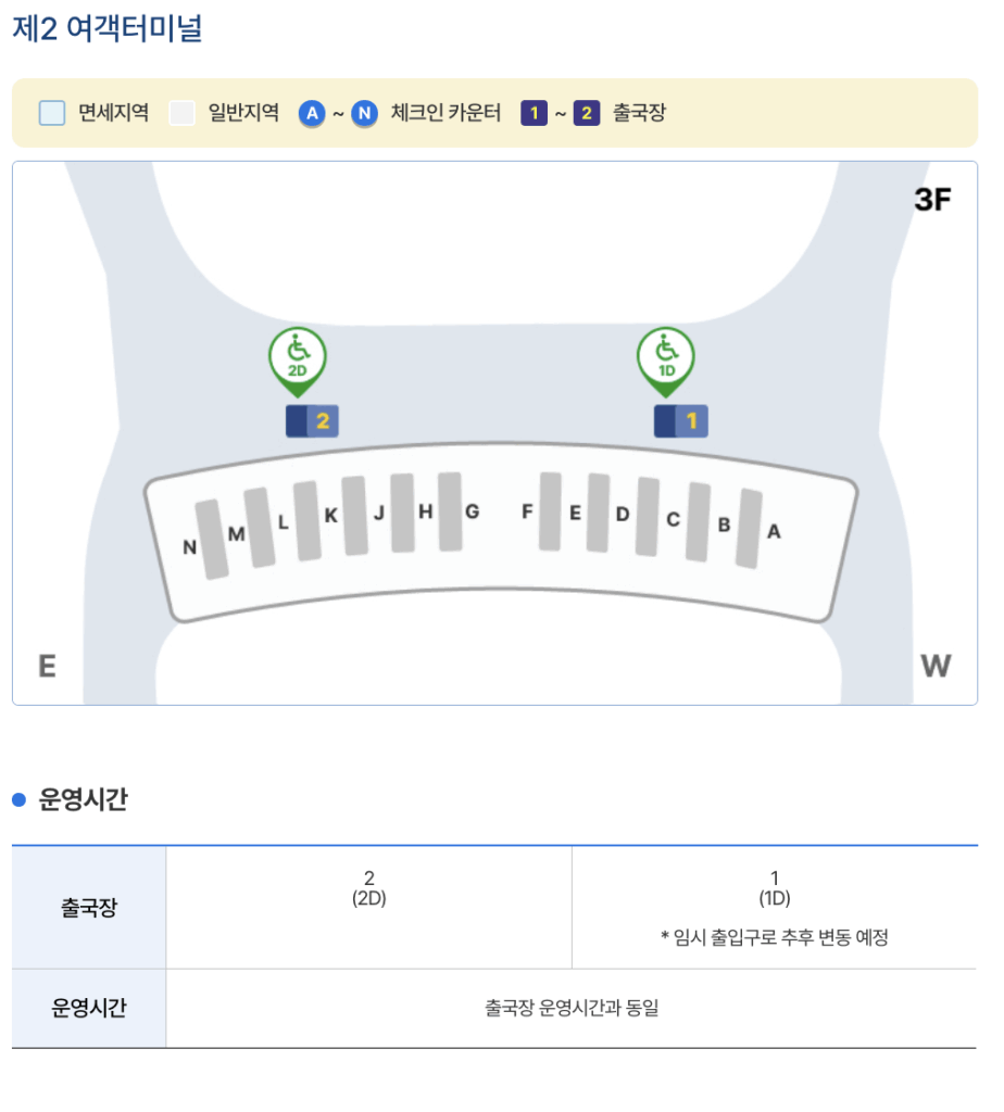 - 출국장 1번 1D 옆, 2번 2D 왼쪽에 각각 1개씩 우대출구가 있습니다.